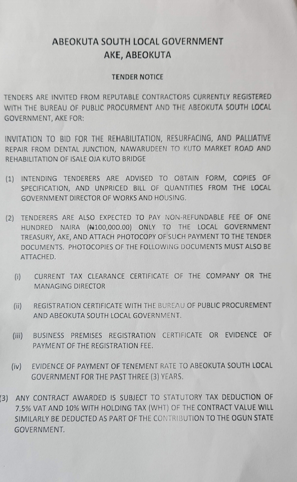 The Council called on interested contractors currently registered with the Bureau of Public Procurement and Abeokuta South Local Government to obtain the necessary tender documents. The documents, including the specification details and unpriced bill of quantities, can be collected from the office of the Director of Works and Housing at the Abeokuta South Local Government Secretariat in Ake.