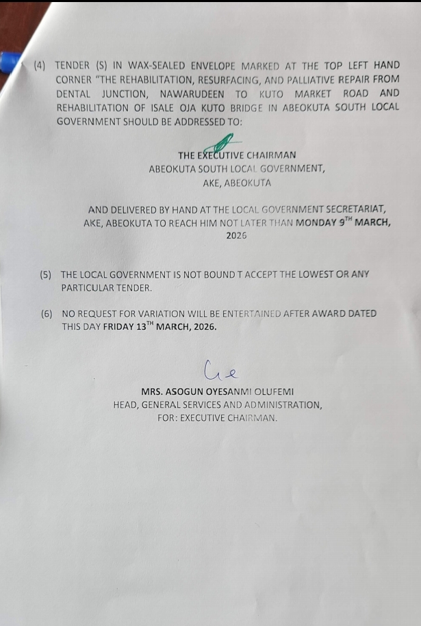 The envelopes should be addressed to the Executive Chairman of Abeokuta South Local Government and delivered by hand at the Council Secretariat in Ake, Abeokuta, on or before Monday, March 9, 2026.