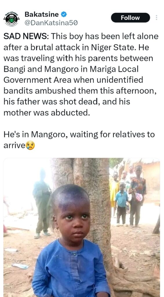 A young boy has been left stranded after armed bandits attacked his family while they were travelling in Niger State, killing his father and abducting his mother.