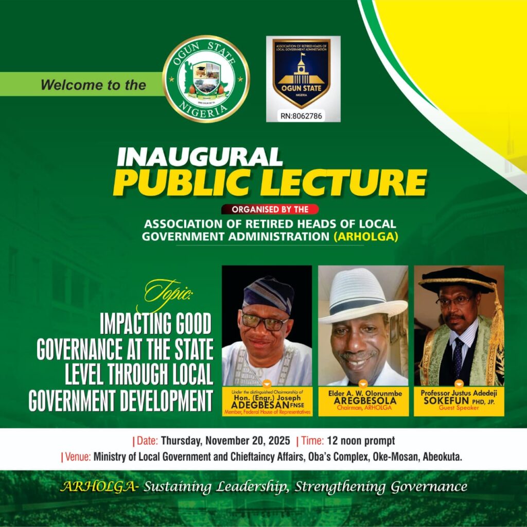 The Association of Retired Heads of Local Government Administration (ARHOLGA), Ogun State Chapter, on Thursday, 20th November 2025, held its maiden Public Lecture at the Obas’ Complex, Oke-Mosan, Abeokuta, an event described by stakeholders as a historic step toward repositioning Local Governments for greater developmental impact.